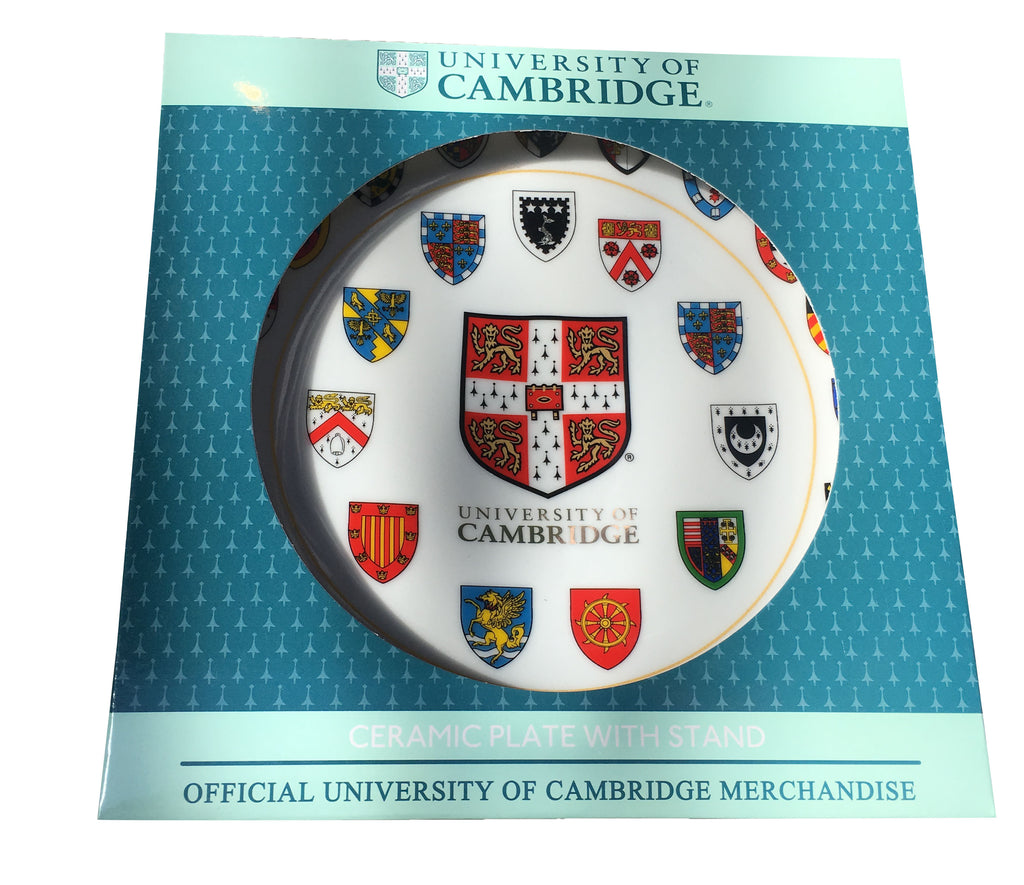 Official Cambridge university ceramic plate with stand and gift box - displays Cambridge university shield and all 31 college shields