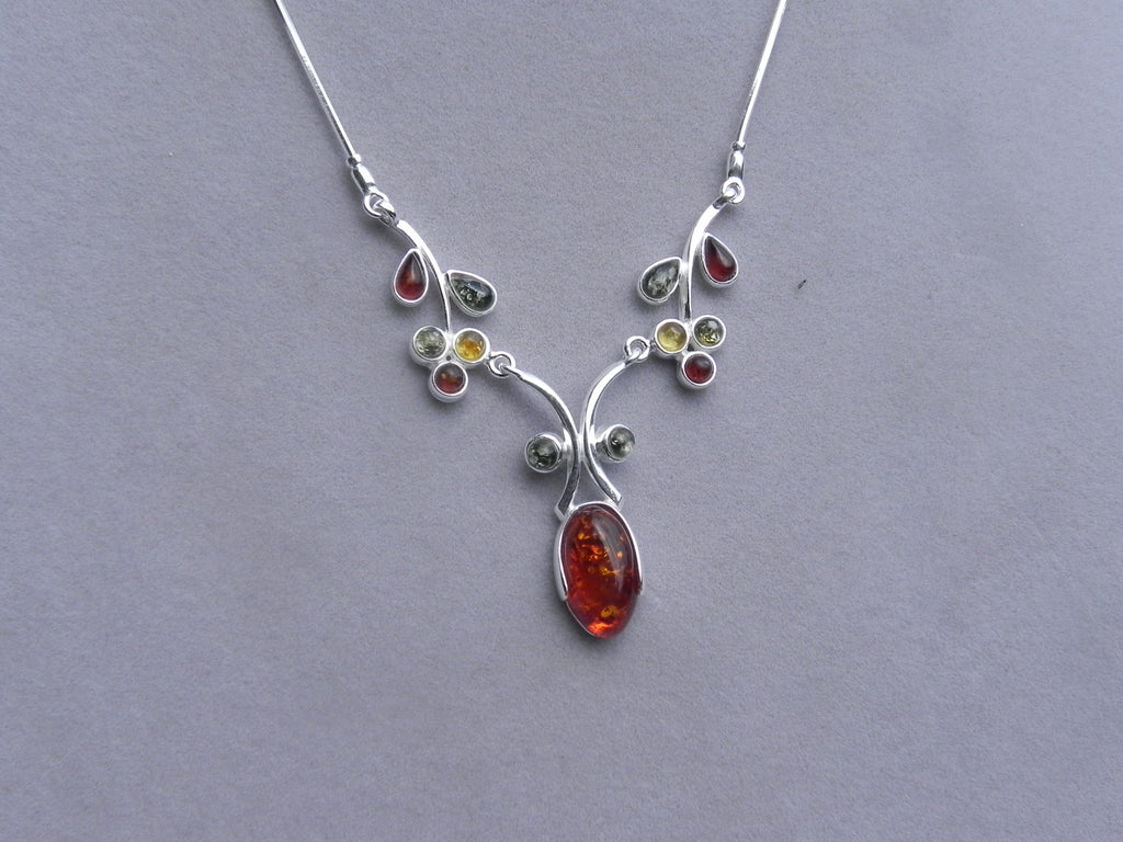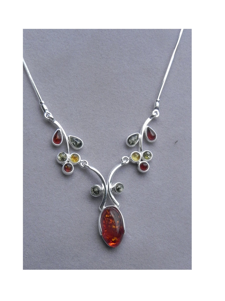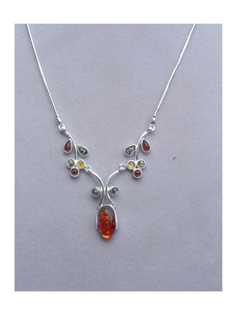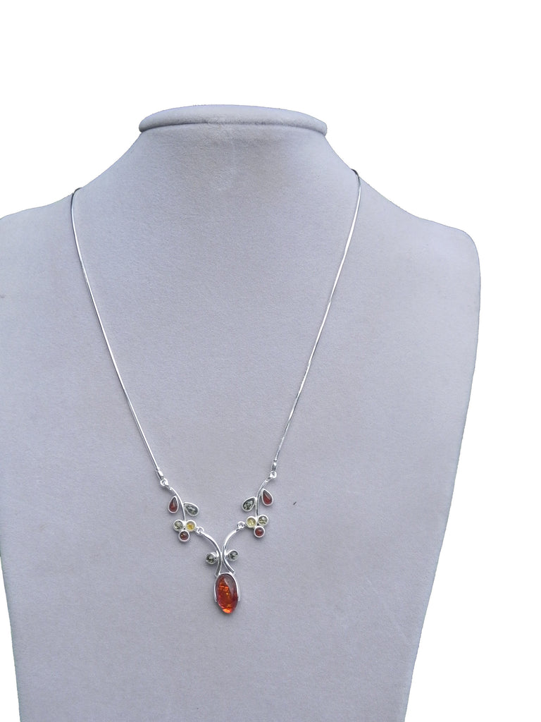 Genuine Baltic Amber Necklace - Multi Color Amber Leaf and Oval Amber - 925 Sterling Silver