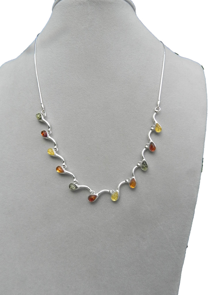Genuine Baltic Amber Necklace - Multi Color Amber Leafy Chain - 925 Sterling Silver